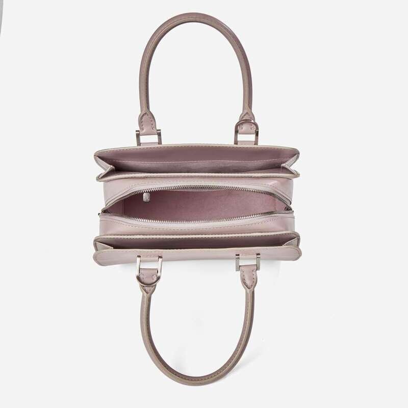 A Louis Vuitton Pont-Neuf PM in Lilac Epi leather, with signature textured epi leather and slip pockets on both sides of bag, with a zip closure and white metal hardware. The bag opens to reveal soft grey microfiber lining, and a slip and zip pockets covered in the alcantara microfiber lining.