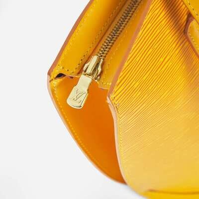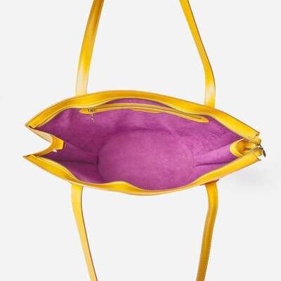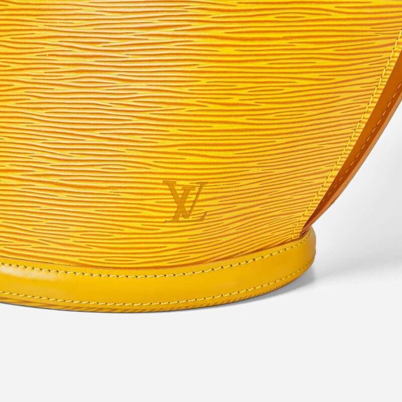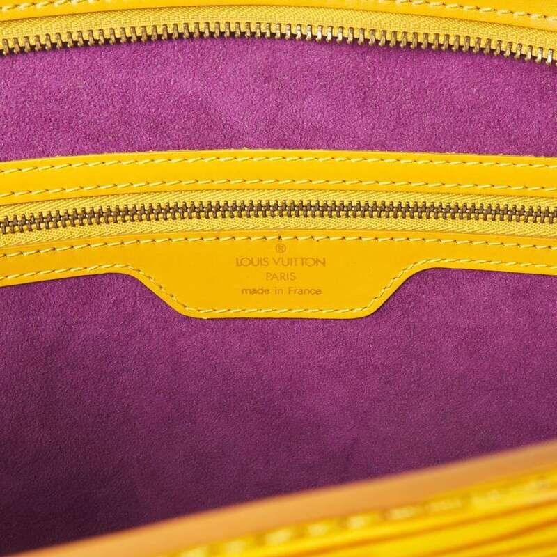A Louis Vuitton Epi St. Jacques shopping tote GM in canary yellow, designed with Epi textured leather and smooth yellow leather double straps, with a zip closure that opens to reveal a roomy main compartment lined with purple alcantara microfiber textile, with one small zipped slot pocket on the interior.
