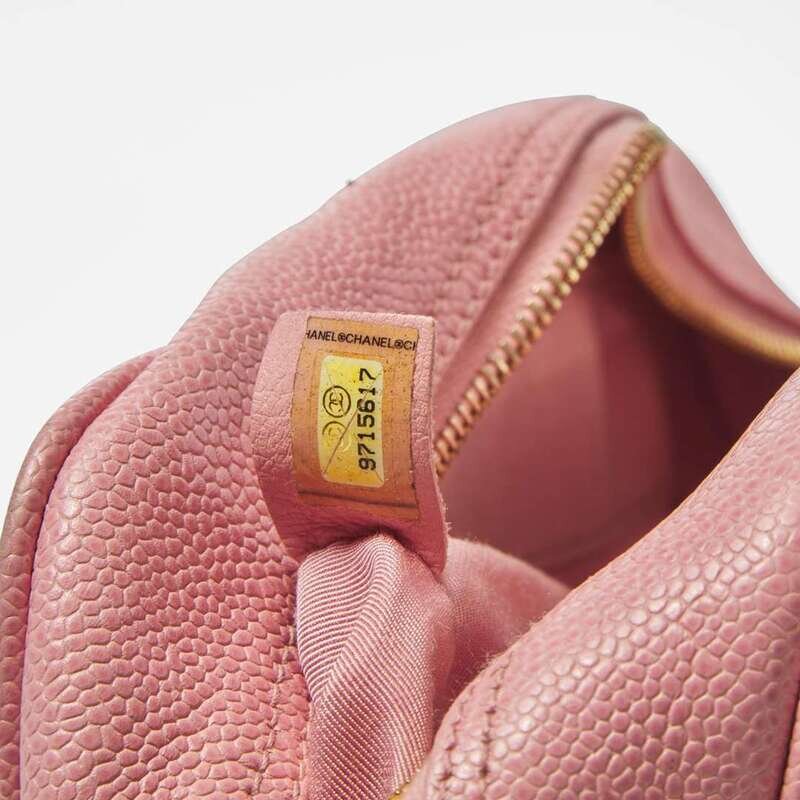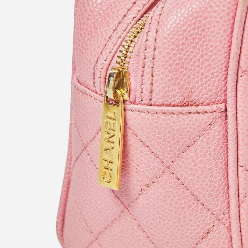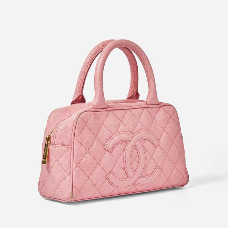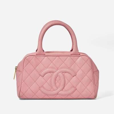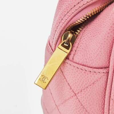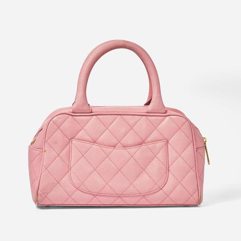 A Chanel pink mini bowling back circa 2004, designed in caviar leather with a pink leather motif of the interlocking "CC" Chanel logo and a slip pocket on the back, designed with diamond quilting in pink thread. The bag is held with two rolled top handles and closes with a yellow metal zip, opening to reveal an open compartment with one zipped pocket.