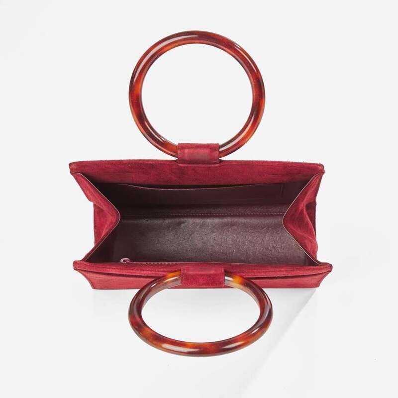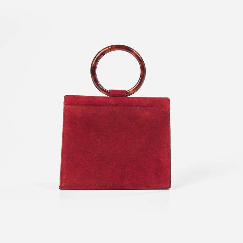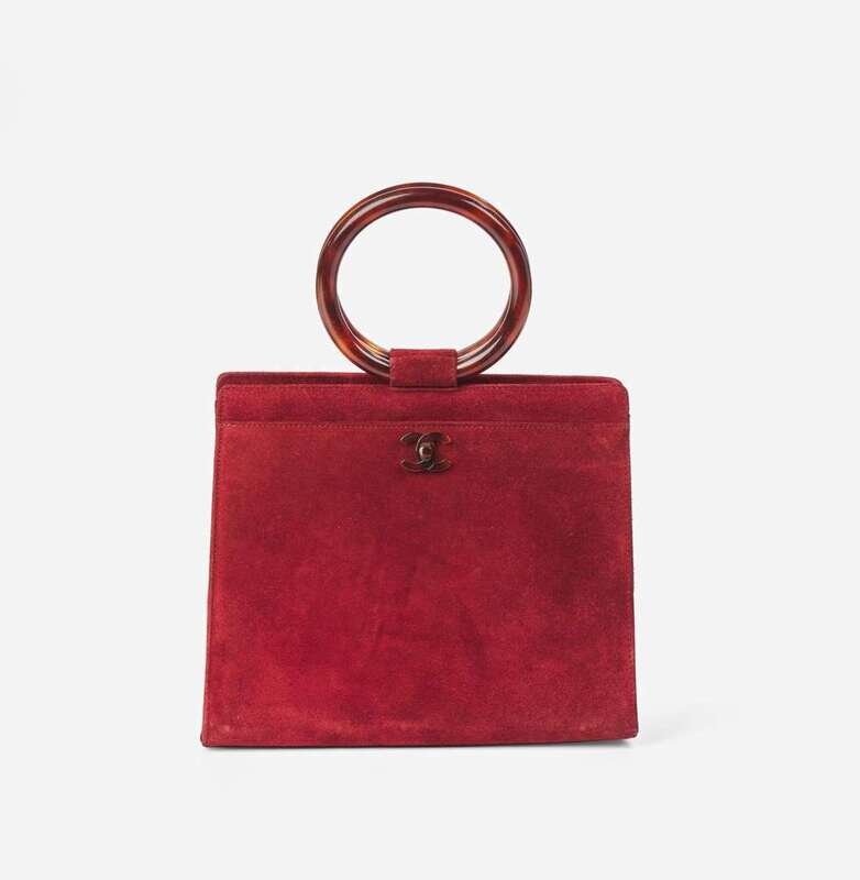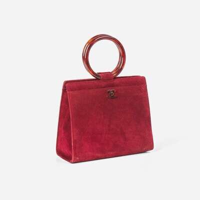 A rare vintage Chanel handbag, designed in burgundy suede calf leather with a round top handle in tortoise shell plastic, a Chanel double "C" logo decoration on the front of bag in tortoise shell plastic, and slip pockets on both sides of the bag. A covered magnetic closure holds the bag shut at the top, and when open reveals a roomy main compartment lined with smooth burgundy leather, with a zipped pocket on one side and a slip pocket on the other.