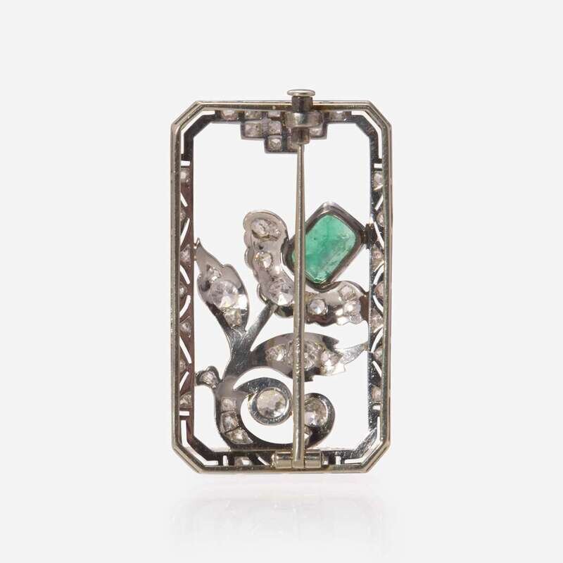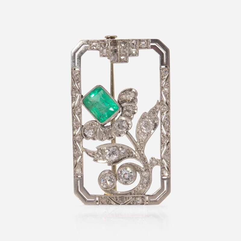 An Art Deco brooch fashioned from 18K white gold, designed in a floral style on a trombone clasp, with an emerald-cut emerald measuring approximately 7.27mm x 5.27mm x 4.61mm, approximately 1.20 carats, and fifty-four old European-cut and rose-cut diamonds of varying sizes. Diamonds are near colorless (H - J), with SI - I clarity. Total estimated weight of diamonds: 1.40 carats.