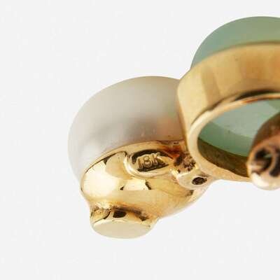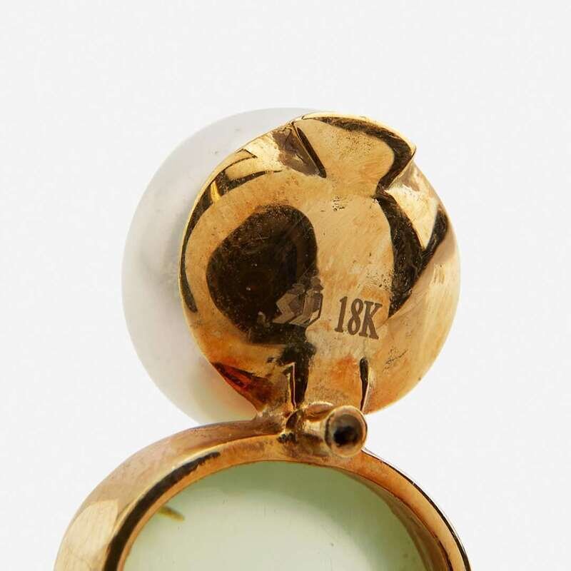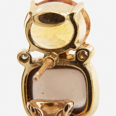Three pairs of 18K yellow gold earrings, the first designed as ear clips for unpierced ears, set with two button pearls each measuring approximately 12.00mm and two oval green chalcedony cabochons each measuring approximately 13.20mm x 10.50mm, the second designed as identical to the first but featuring blue chalcedony cabochons each measuring approximately 12.60mm x 10.40mm, and the third designed for pierced ears, and set with smoky quartz cabochons each measuring approximately 9.20mm x 11.50mm, two faceted oval-cut citrines each measuring approximately 11.00mm x 9.00mm, and four round brilliant-cut diamonds.
