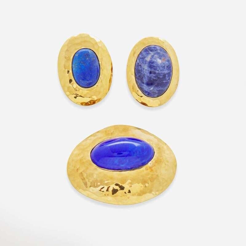 A suite of 14K yellow gold jewelry set with lapis lazuli in a hammered gold finish, one earring set with a lapis lazuli measuring approximately 17.70mm x 12.72mm, one set with a lapis lazuli measuring approximately 24.25mm x 17.43mm, and the brooch set with a lapis lazuli measuring approximately 29.21mm x 15.87mm.