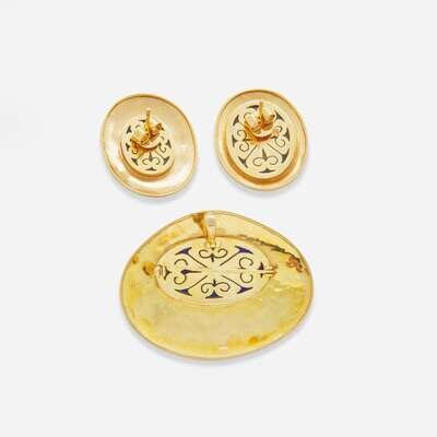 Earrings Length: 1 1/4in; Earrings Width: 1in; Brooch Length: 2in; Brooch Width: 1 1/2in; Weight: 19.6 Gross dwt.