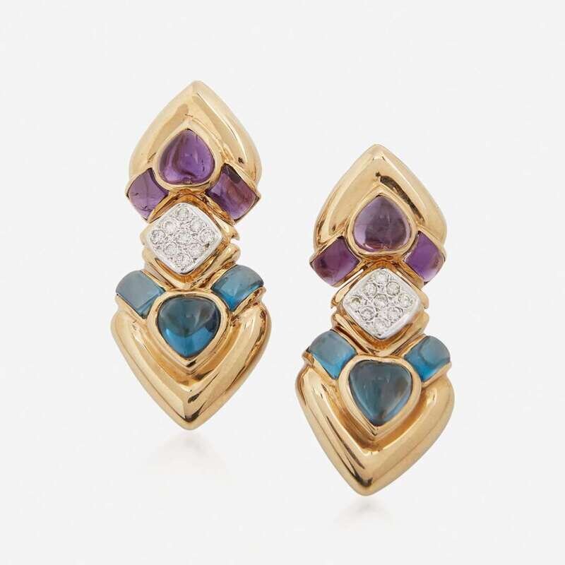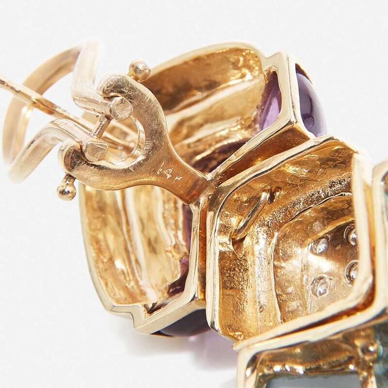 A pair of 14K yellow gold earrings on stud posts with omega clip backs, the centers of which are set with nine round-cut diamonds, the tops are set with six amethysts, and the bottoms are set with six blue topaz. Diamonds are near colorless (G - J), with SI - I clarity. Total estimated weight of diamonds: 0.30 carats.