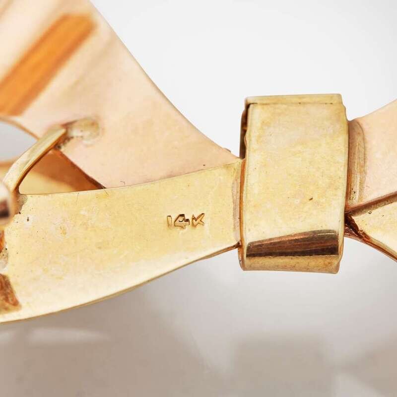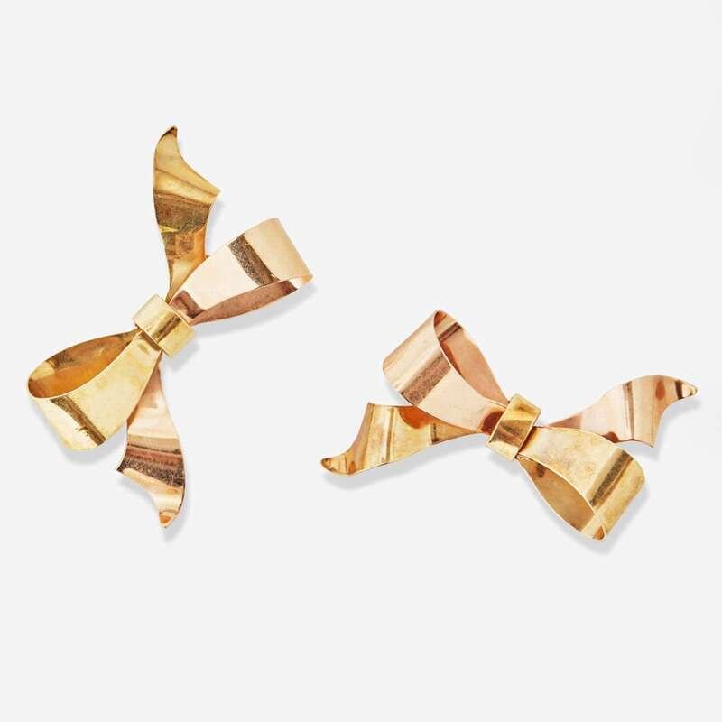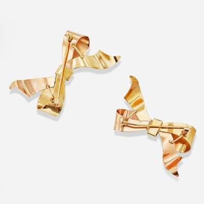 A matching set of two retro two-tone yellow and rose gold brooches designed as bows fashioned from 14K gold.