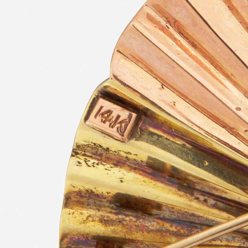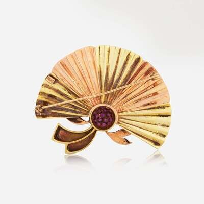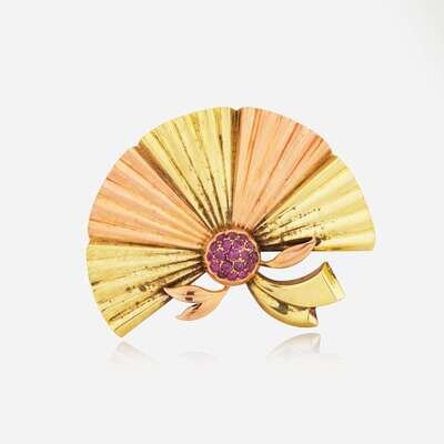 A retro two-tone yellow and rose gold brooch designed as a fan, centering a cluster of nineteen round-cut rubies each measuring approximately 2.60mm.