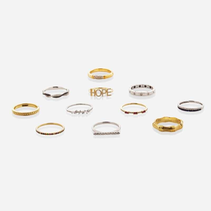 An assorted collection of eleven gold rings, including a 14K white gold band by Roberto Coin, a 14K white gold ring featuring round and emerald-cut diamonds, a 14K white gold ring featuring white and black diamonds set in a twist design, a 14K white gold ring featuring a bar set with diamonds, an 18K white gold ring featuring diamonds and sapphires, an 18K yellow gold band by Roberto Coin featuring a textured bamboo design, a 14K yellow gold ring with rubies and diamonds, a 14K yellow gold "HOPE" ring featuring diamonds, an 18K yellow gold ring featuring diamonds, a 14K multi-gemstone band, and an 18K yellow gold band.
