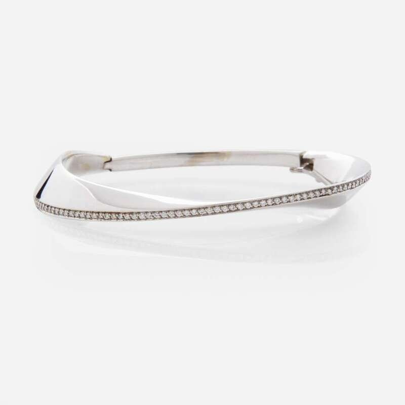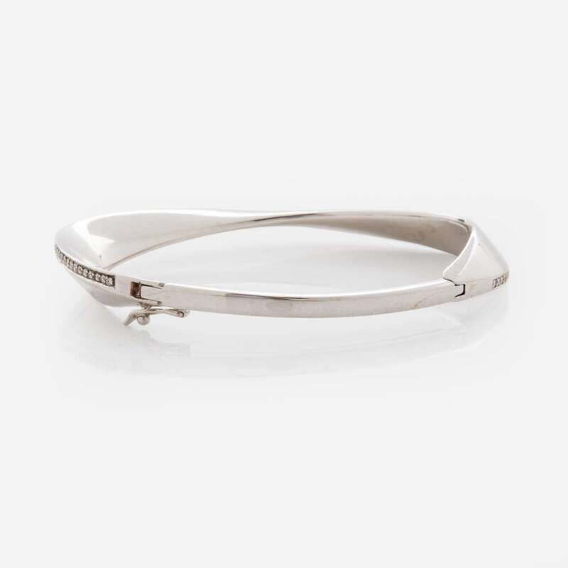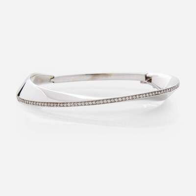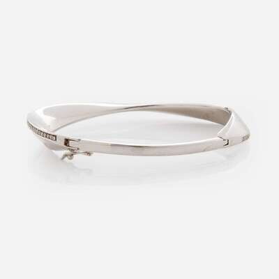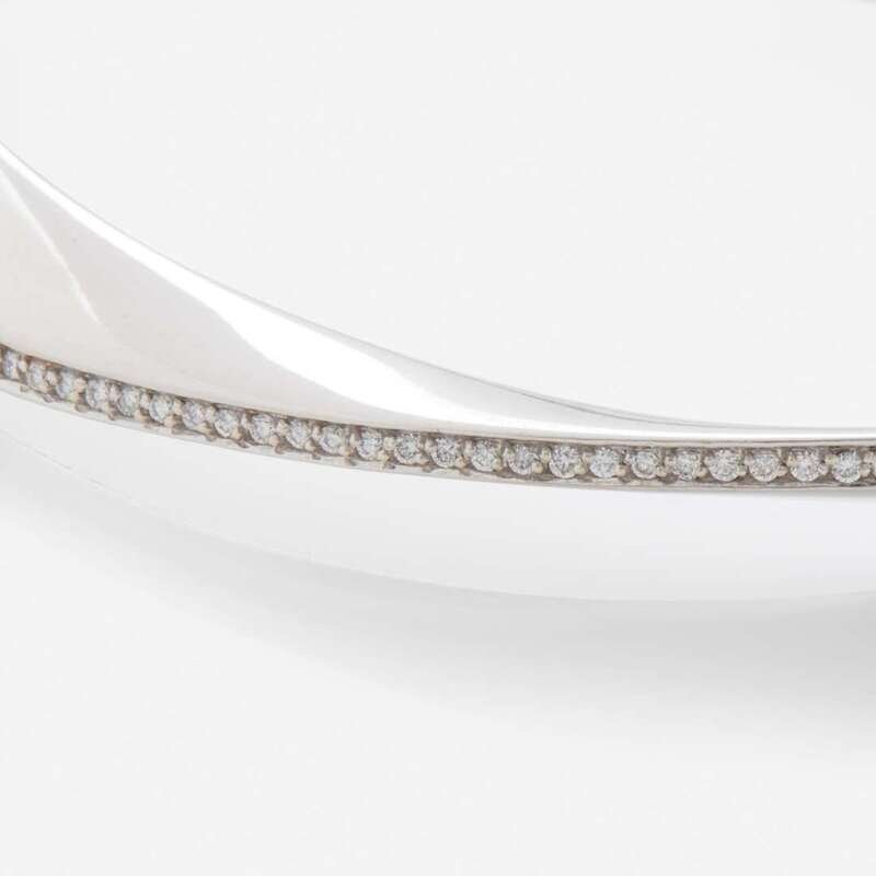 A contemporary bangle bracelet fashioned from 14K white gold, designed in a contoured oval-shape with a polished finish, accented by a line of ninety full-cut diamonds. Diamonds are near colorless (F - H), with VVS1 - VS1 clarity. Total estimated weight of diamonds: 0.58 carats.