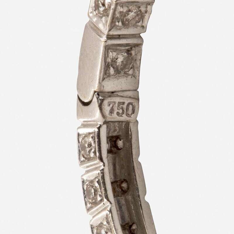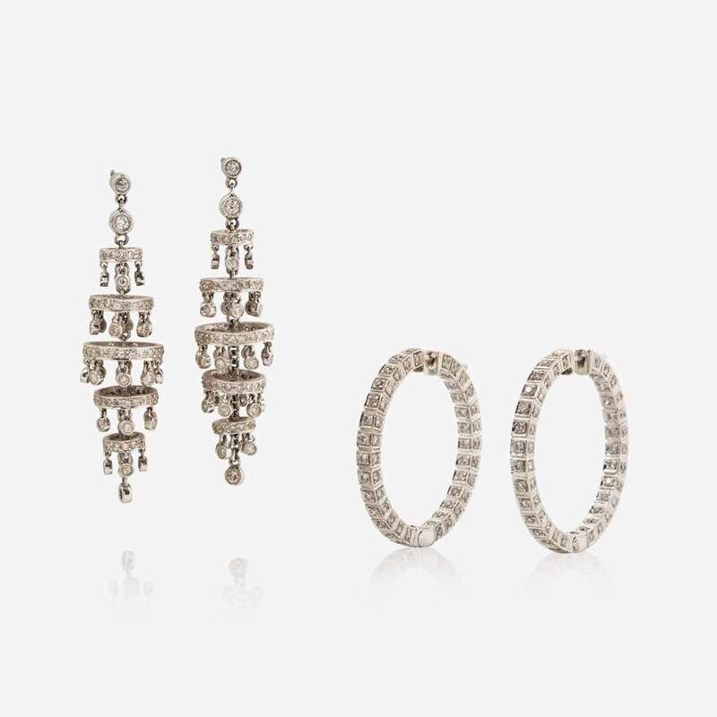 Two pairs of earrings, one crafted from 18K white gold designed as inside-out hoops, with sixty-eight round brilliant-cut diamonds, approximately 0.60 carats altogether, with faint color (J - K), and SI2 - I1 clarity, and the other designed as chandeliers with diamond dangles set in 14K white gold, set with two hundred sixty-two round brilliant-cut diamonds, approximately 1.00 carat altogether, near colorless (I - J), with SI1 - I1 clarity. Total estimated weight of diamonds: 1.60 carats.