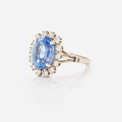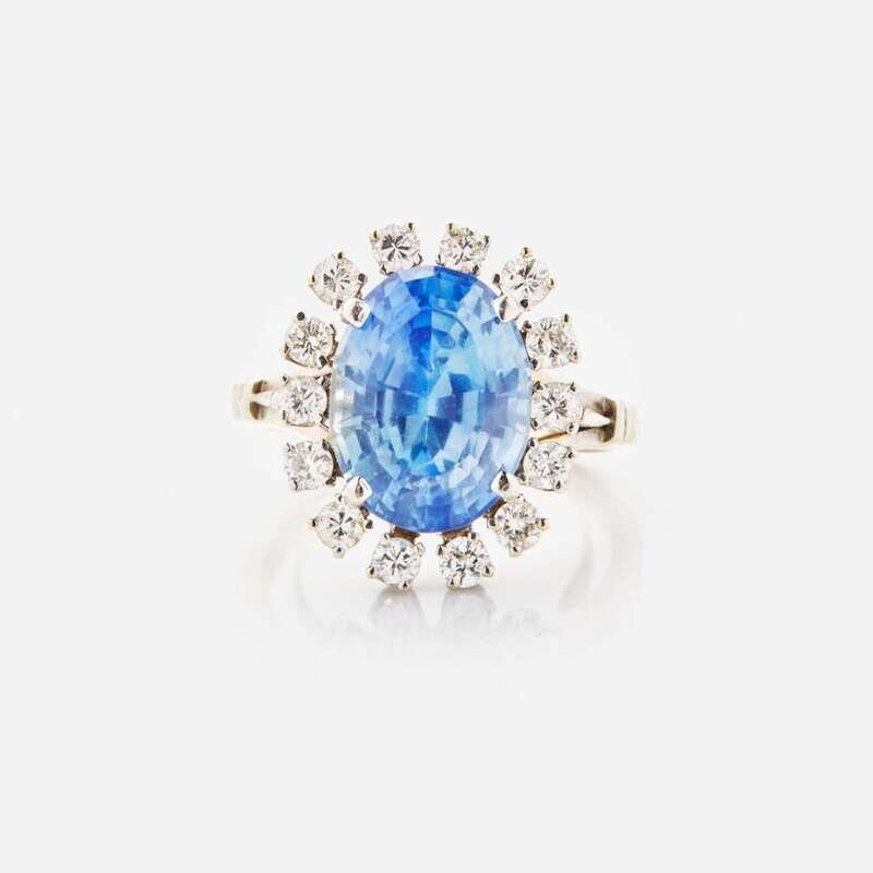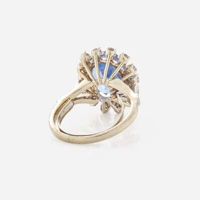 A two-tone 14K white and yellow gold ring, set with an oval-cut sapphire measuring approximately 12.20mm x 9.16mm, approximately 6.00 carats, surrounded by a halo of fourteen round brilliant-cut diamonds. Diamonds are near colorless (I - J), with I clarity. Total estimated weight of diamonds: 0.70 carats.