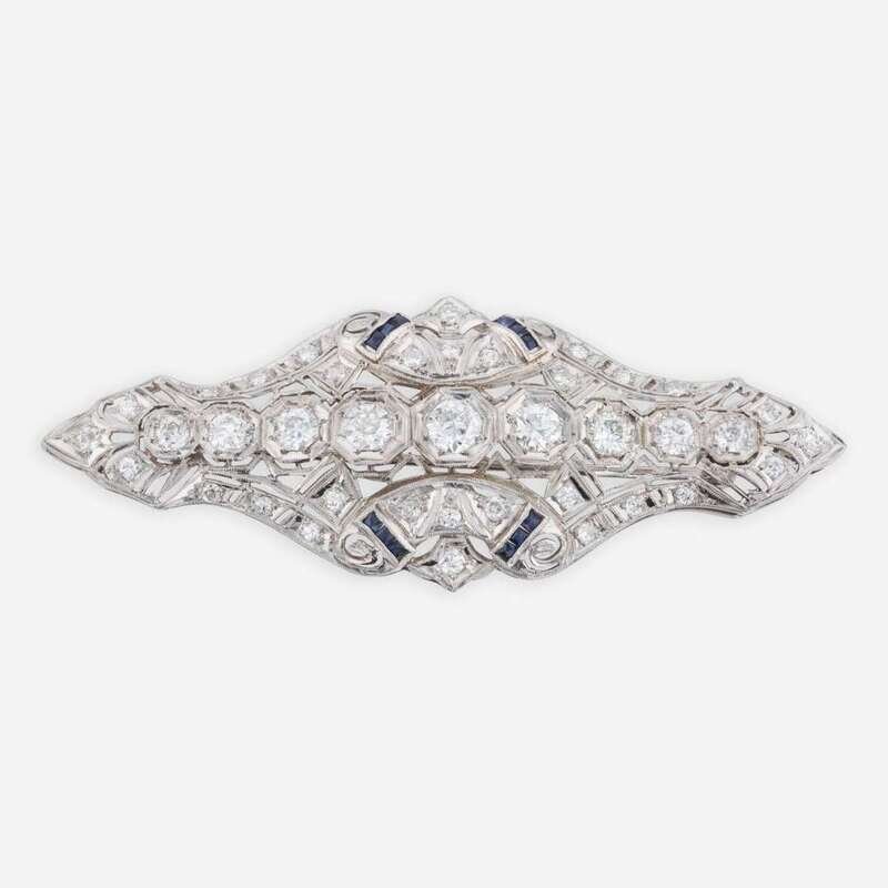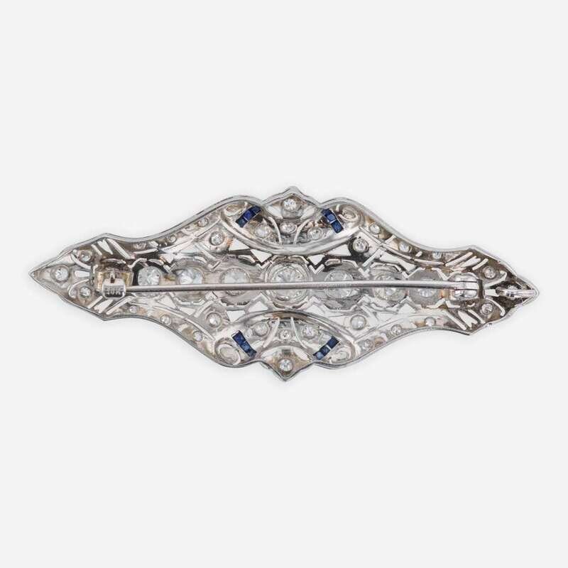 An Art Deco diamond and sapphire 14K white gold pendant, also functioning as a brooch, set with nine old European-cut diamonds at the center, surrounded by various smaller accent diamonds and twelve baguette-cut synthetic sapphires. Diamonds are near colorless (G - J) and SI - I in clarity. Total estimated weight of diamonds: 2.70 carats.