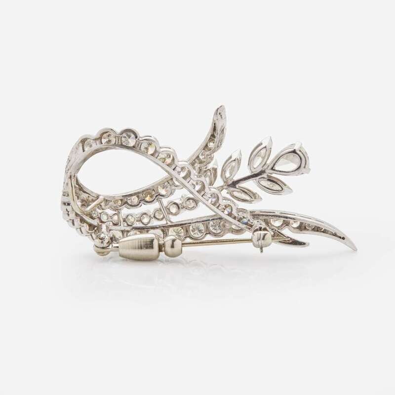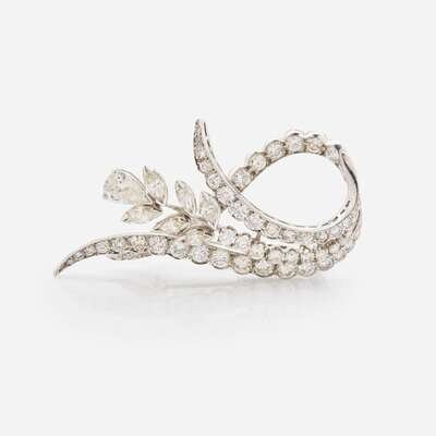 A platinum spray brooch in a foliate design, set with one pear-shape diamond weighing approximately 0.65 carats, six marquise-cut diamonds, and sixty-three round brilliant-cut diamonds. Diamonds are near colorless to faint color (J - L), with SI clarity. Total estimated weight of diamonds: 4.50 carats.