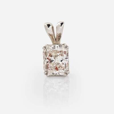 A 14K white gold pendant, set with one radiant-cut pendant weighing approximately 1.55 carats. Diamond is near colorless to faint color (I - K), with blue fluorescence, and I clarity.