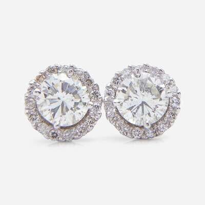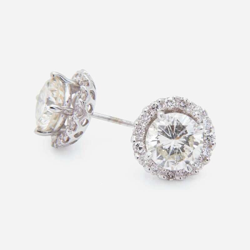 A pair of 18K white gold earrings on stud posts, each centering a round brilliant-cut diamond estimated to weigh 1.30 carats and 1.20 carats respectively, with (M) color, and I clarity. Center diamonds are accented by earring jackets functioning as a halo, with thirty round brilliant-cut diamonds with (J - M) color, and SI - I clarity. Total estimated weight of diamonds: 2.80 carats.