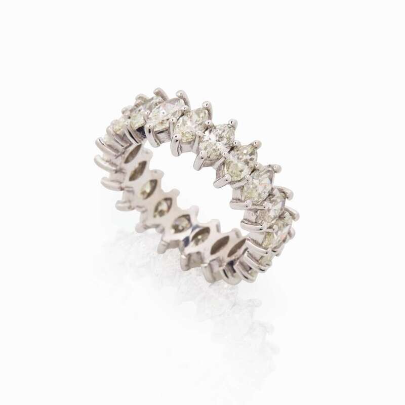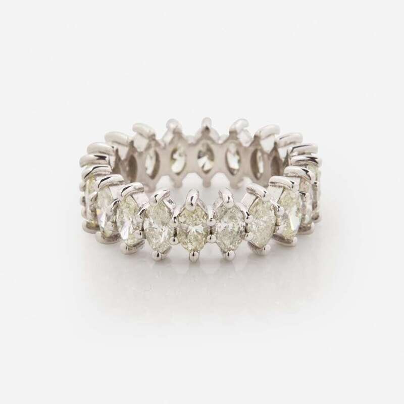 An 18K white gold eternity band, set with twenty marquise-cut diamonds. Diamonds have faint yellow color (K - M), with I clarity. Total estimated weight of diamonds: 4.71 carats.