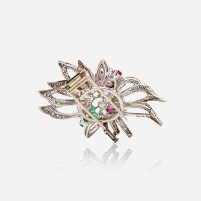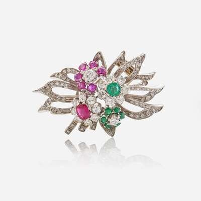 A 14K white gold brooch designed as a bouquet of flowers featuring oval and round-cut rubies, round-cut emeralds, and round brilliant-cut and single-cut diamonds. Diamonds are near colorless to faint color (J - K), with SI - I clarity. Total estimated weight of diamonds: 3.85 carats.