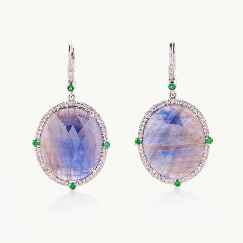 A pair of 18K white gold earrings each centering an oval-shape faceted sapphire, accented by eight round-cut tsavorite garnets each measuring approximately 1.80mm, and round brilliant-cut diamonds. Diamonds are near colorless (I - J), with SI clarity. Total estimated weight of diamonds: 0.52 carats.