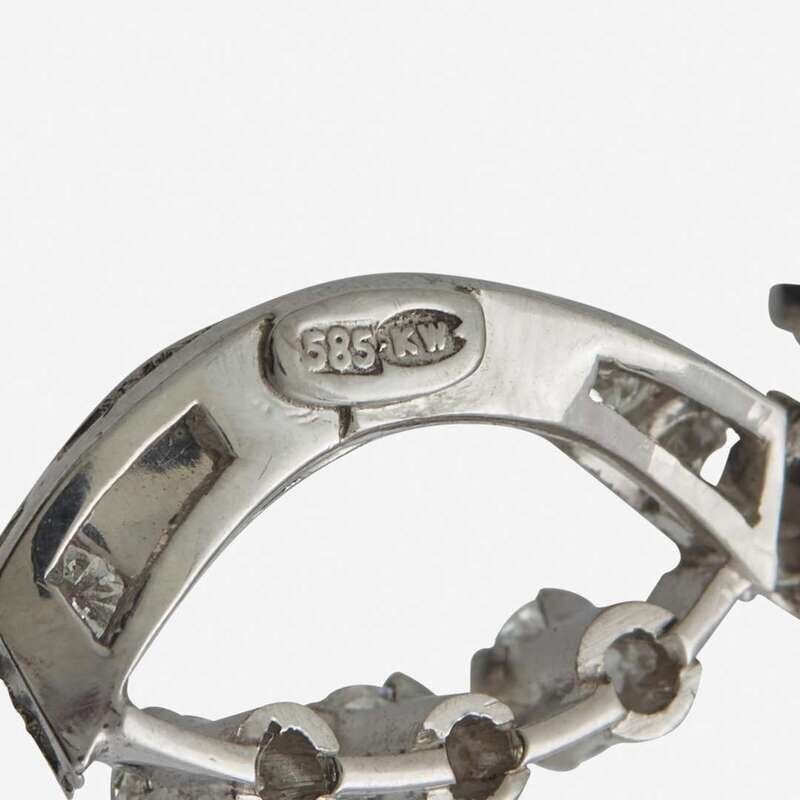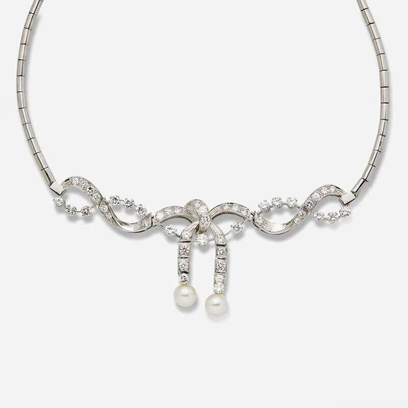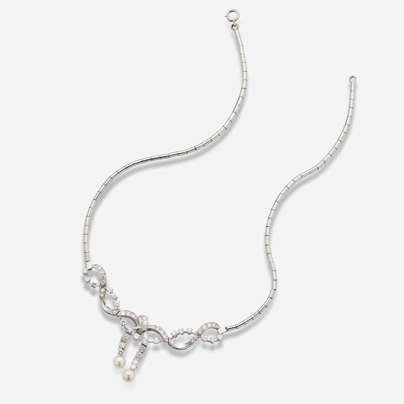 A 14K white gold necklace featuring a ribbon design, set with forty-seven round brilliant-cut diamonds and two cultured pearls each measuring approximately 7.00mm. Diamonds are near colorless (G - H), with SI - I clarity. Total estimated weight of diamonds: 3.60 carats.