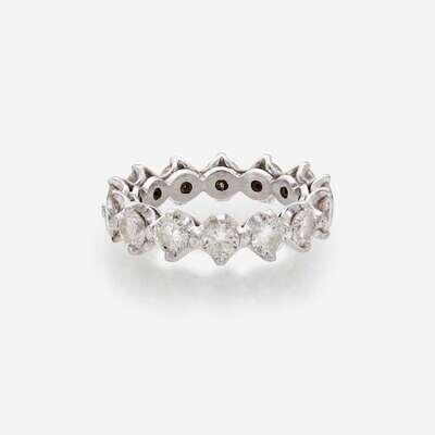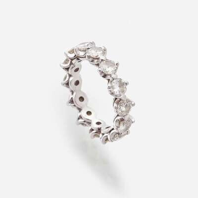 A platinum eternity band, set with fourteen round brilliant-cut diamonds. Diamonds are near colorless (H - I), with SI clarity. Total estimated weight of diamonds: 2.80 carats.