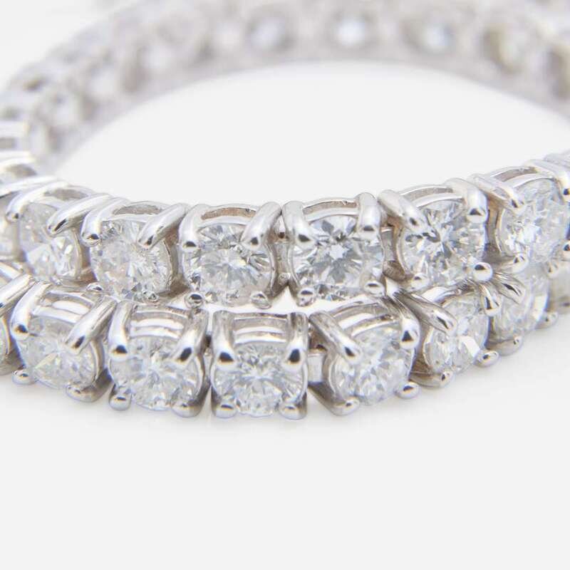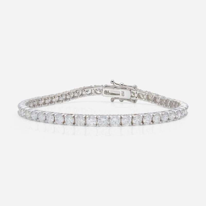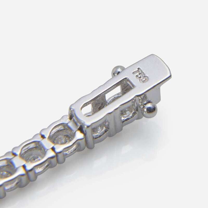 An 18K white gold line bracelet set with forty-eight round brilliant-cut diamonds, near colorless (H - L), with I clarity. Total estimated weight of diamonds: 6.50 carats.