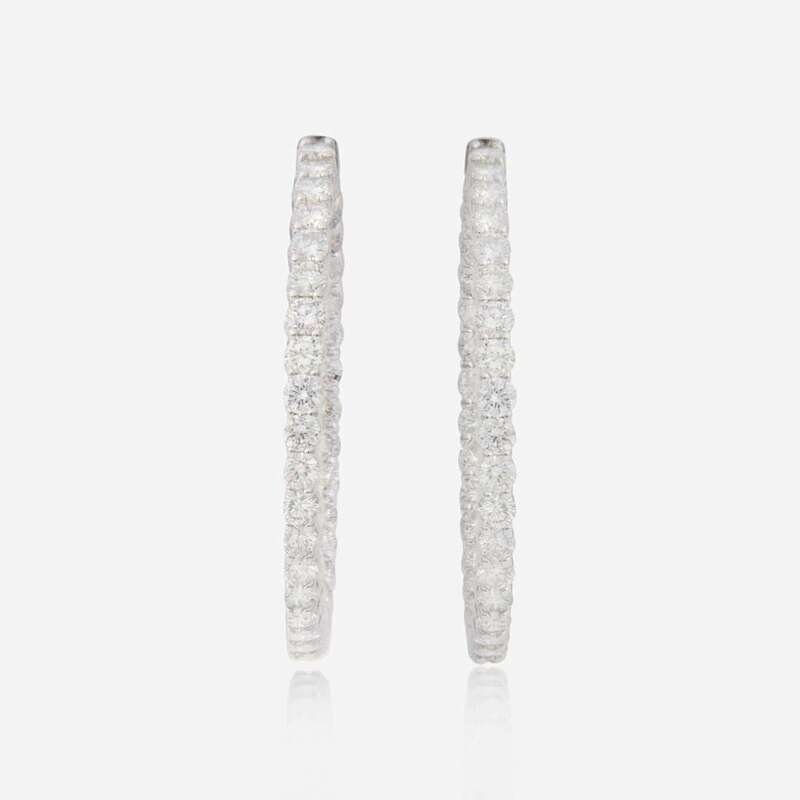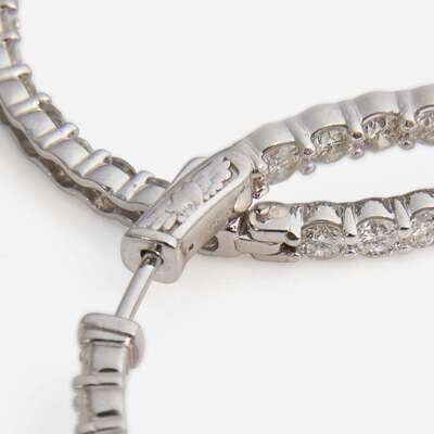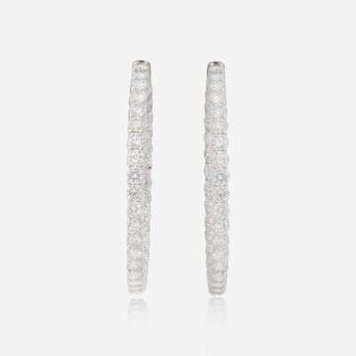 A pair of 14K white gold hoop earrings designed in an inside-out style, set with seventy round brilliant-cut diamonds. Diamonds are mostly near colorless to faint color (H - K) with a few diamonds with light color (L - M), and I clarity. Total estimated weight of diamonds: 7.50 carats.