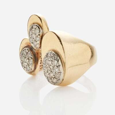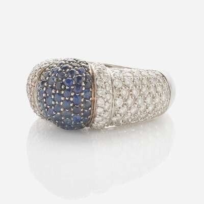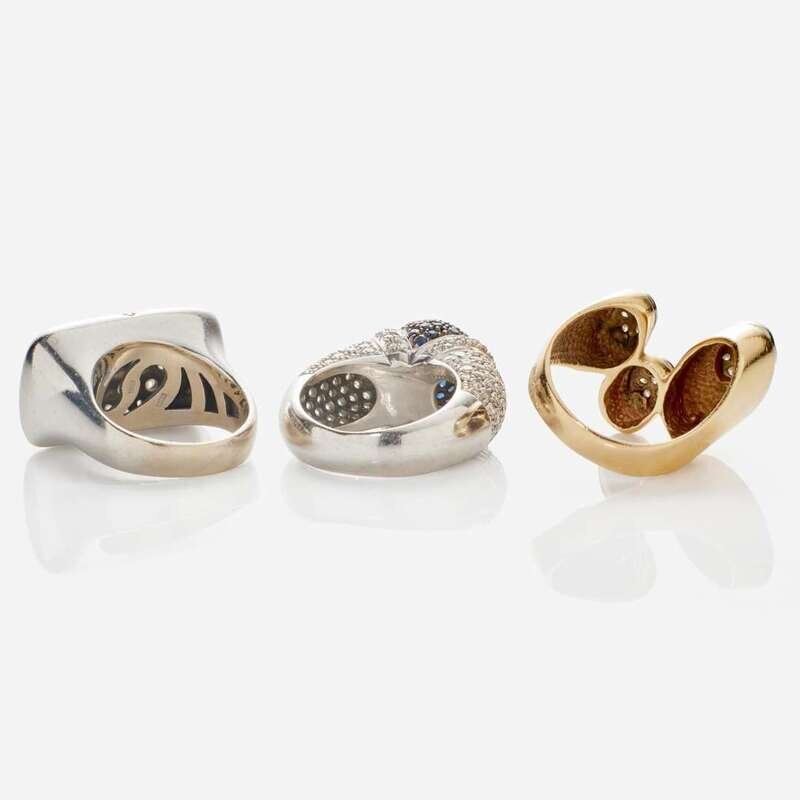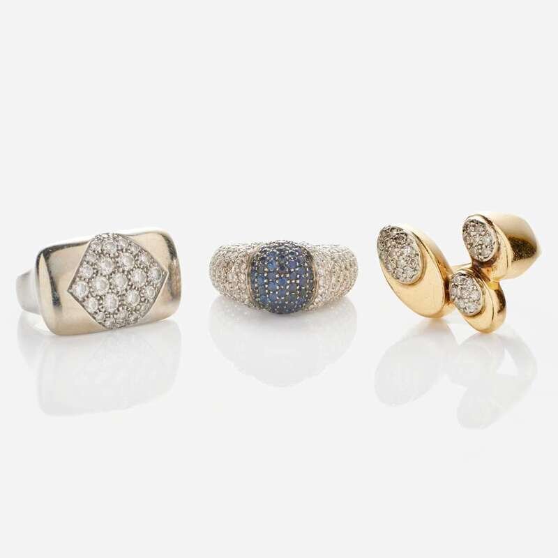 A collection of three ladies rings, including an 18K white gold Italian ladies ring set with diamonds, approximately 1.50 carats altogether, near colorless (G - J), with VS - SI clarity, a 14K yellow gold ring set with twenty-six round-cut diamonds, approximately 0.25 carats altogether, and an 18K white gold ladies bombe ring with pavé-set sapphires and diamonds, approximately 1.25 carats altogether, near colorless (G - J), with VS - SI clarity. Total estimated weight of diamonds: 3.00 carats.