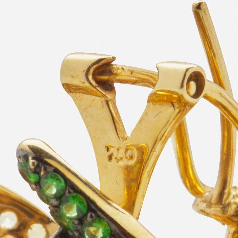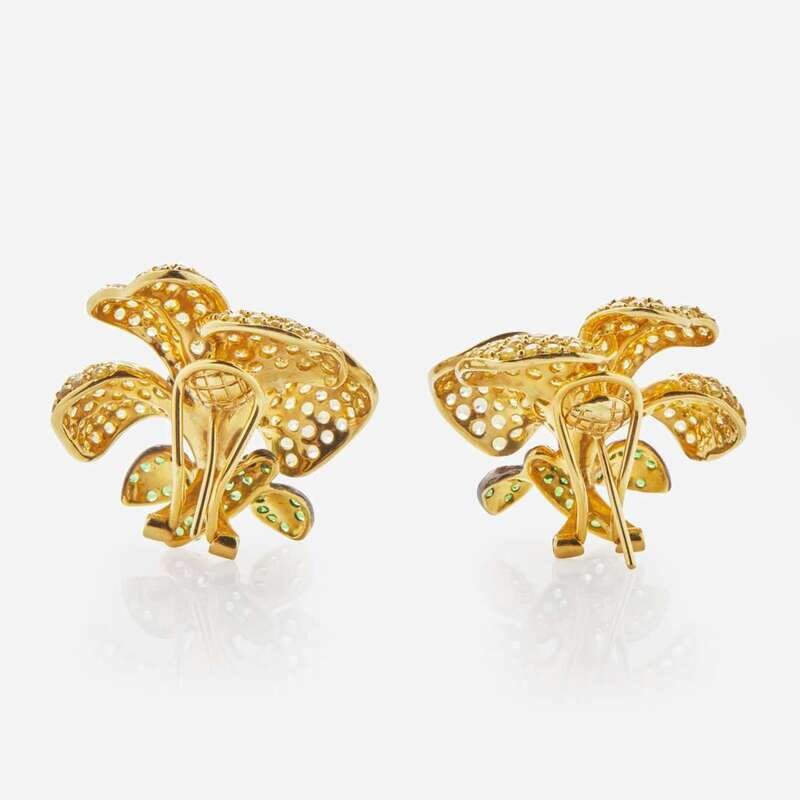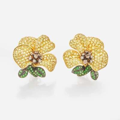 A pair of 18K yellow gold earrings designed as flowers on stud posts for pierced ears, set with approximately two hundred eighty-four yellow topaz each measuring approximately 1.50mm, fifty-four round-cut emeralds measuring from approximately 1.00mm at the smallest to 1.30mm at the largest, and sixteen round-cut fancy brown diamonds measuring from approximately 1.80mm at the smallest to 2.20mm at the largest. Total estimated weight of diamonds: 0.50 carats.