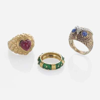 A collection of three ladies rings, one designed from 18K yellow gold and set with green guilloche enamel, one crafted from 18K yellow gold and set with a heart-shape tourmaline cabochon measuring approximately 9.00mm x 9.00mm set in a quilted pattern ring, and one a two-tone yellow and white gold ring depicting an owl and set with two synthetic star sapphire cabochons each measuring approximately 4.50mm, accented by fifteen single-cut diamonds. Total estimated weight of diamonds: 0.05 carats.