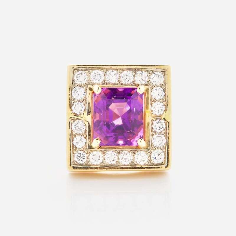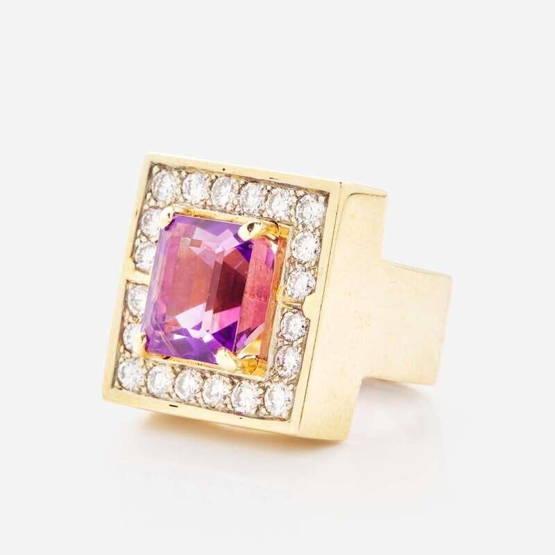 A wide 14K yellow gold ring, designed in a square, centering an emerald-cut amethyst measuring approximately 11.0mm x 9.45mm x 10.64mm, approximately 7.00mm, surrounded by twenty round brilliant-cut diamonds, near colorless (G - H), with VS2 - SI1 clarity. Total estimated weight of diamonds: 2.00 carats.