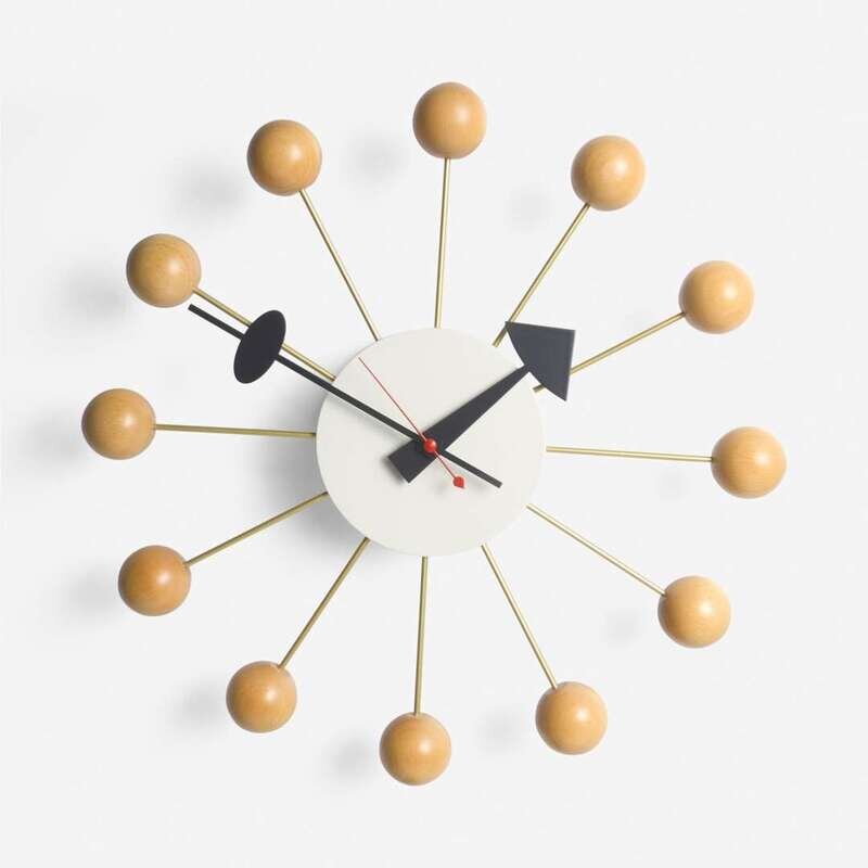 The Ball clock with white enameled metal face, black hands, brass spokes, and lacquered wood balls
