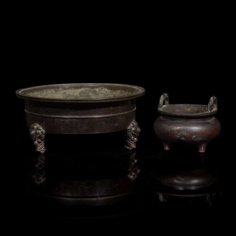 The larger one with three elephant-head feet, a simple raised rib to waist, a broad horizontal rim; the other censer of archaistic form "liding", with a pair of twisted vertical handles; both bear six-character Xuande mark.