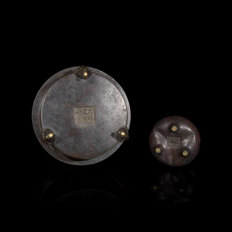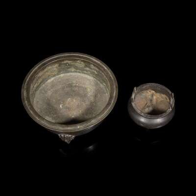 Two Chinese patinated bronze censors 加漆銅香爐兩件 Apocryphal Xuande marks ????