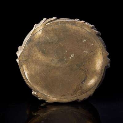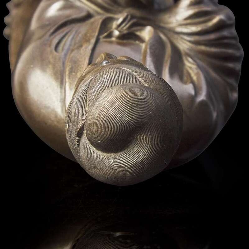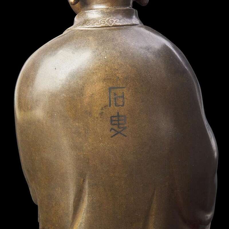 Her hands gracefully rest above her waist, her hair in finely-detailed coiffure, a notable ajna to the center of her forehead, cloudscroll pattern to the border of her gorgeous draped robe and base, bearing a signature of "Shisou" on her back, all finely-inlaid with silver wire.