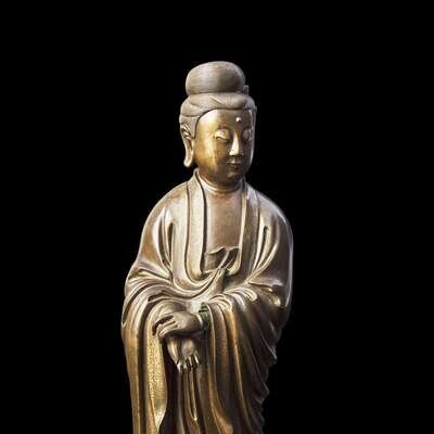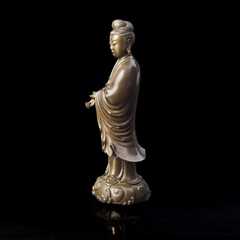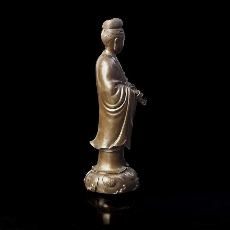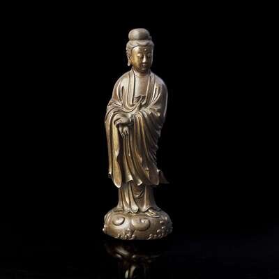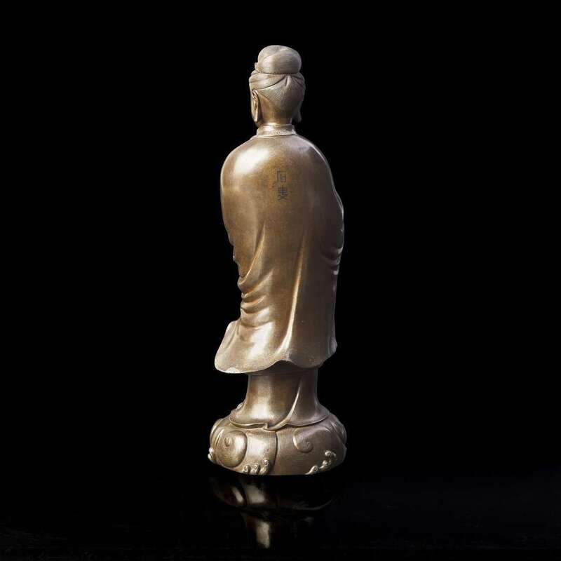 A finely cast and patinated and silver-wire inlaid figure of Guanyin 漆銅嵌銀絲觀音造像 Shisou mark ???