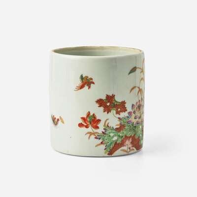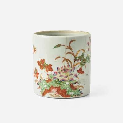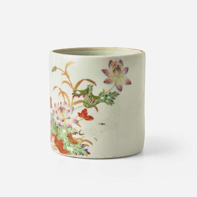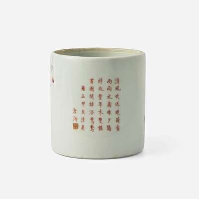 An unusual Chinese famille rose "Lotus and Crane" brush pot with poem 粉彩蓮鶴詩文筆筒
