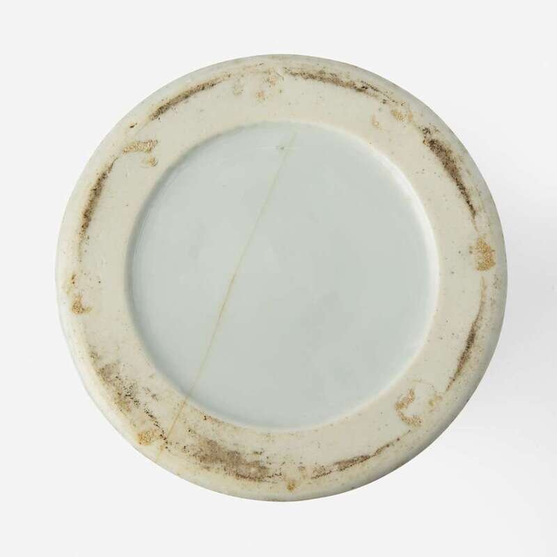 Painted with overglaze enamels and gilding, depicting lotus, crane, duck, and birds; a relevant poem inscription to the other side, signed "Canghai", bearing a date equivalent to summer of Yongzheng Jiachen year (1724)