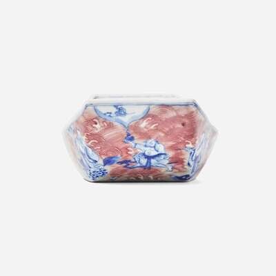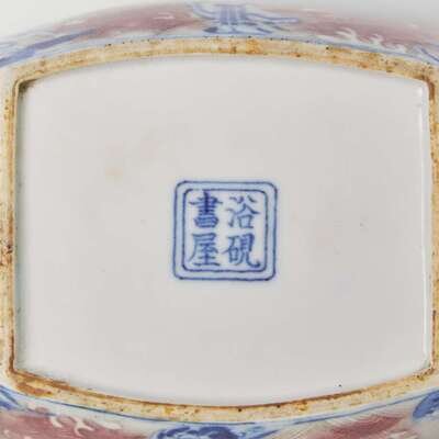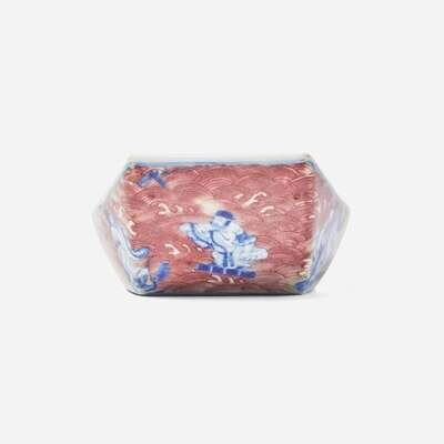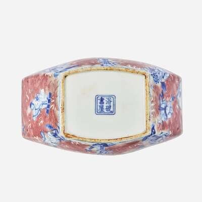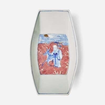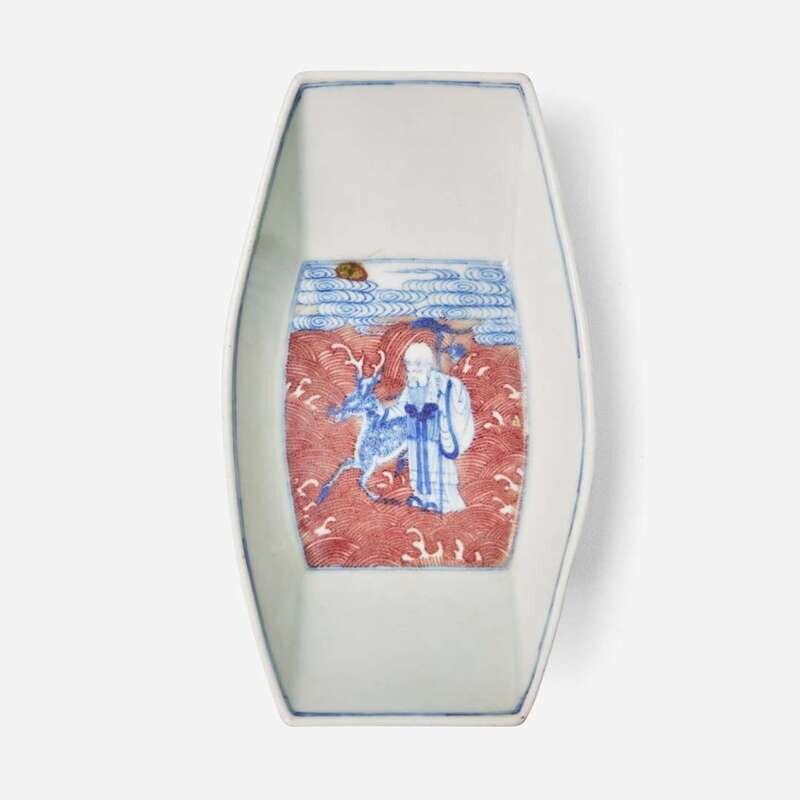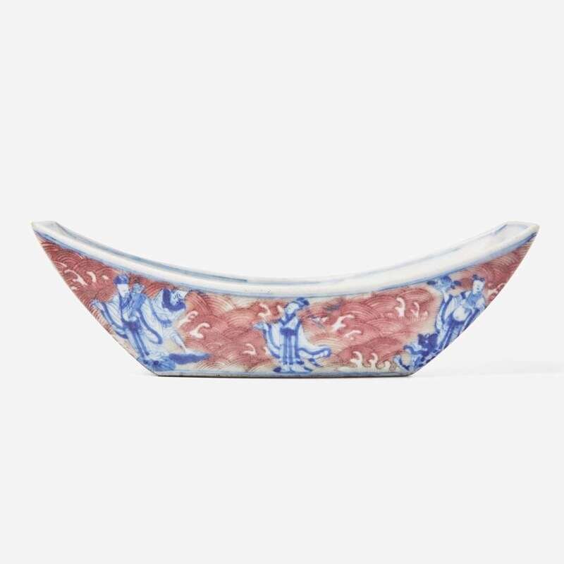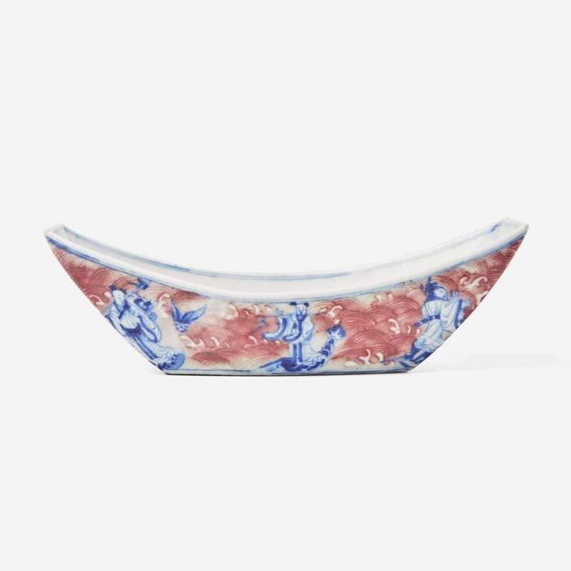 Of unusual boat or ingot-form, finely decorated with the eight Daoist immortals in underglaze blue, and red waves, the interior centered by Shoulao and a deer among waves and clouds, a four-character hall mark reading "yuyan shuwu" within a double-square in underglaze blue to the underside.