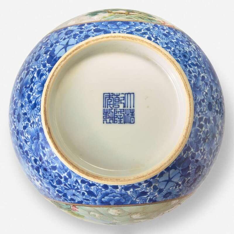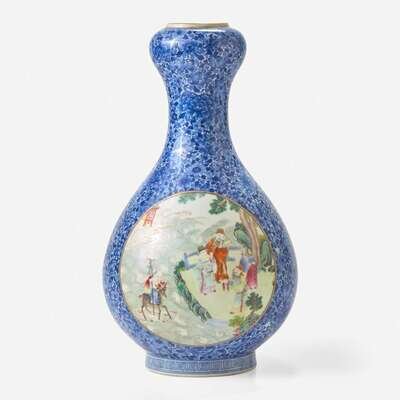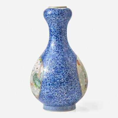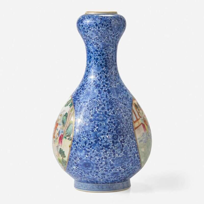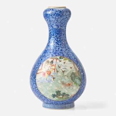A finely-decorated Chinese yangcai and underglaze blue-decorated porcelain garlic-bulb mouth vase 洋彩灑藍地蒜頭瓶 Qianlong six-character seal mark ?????