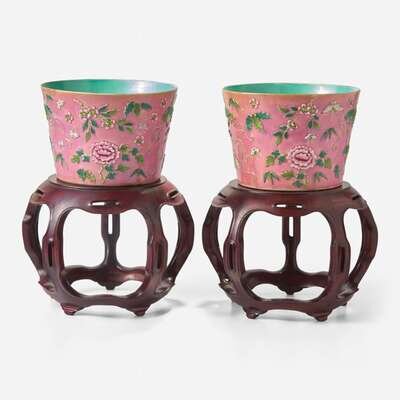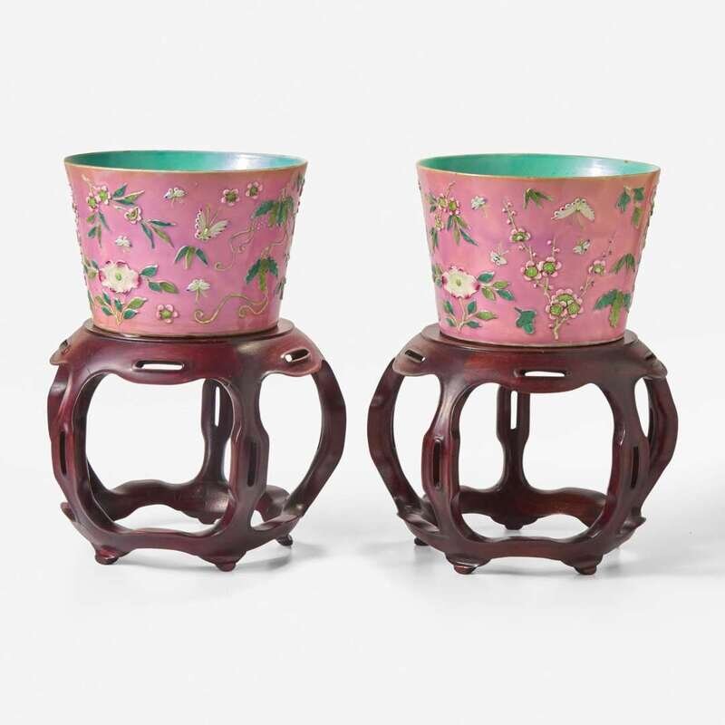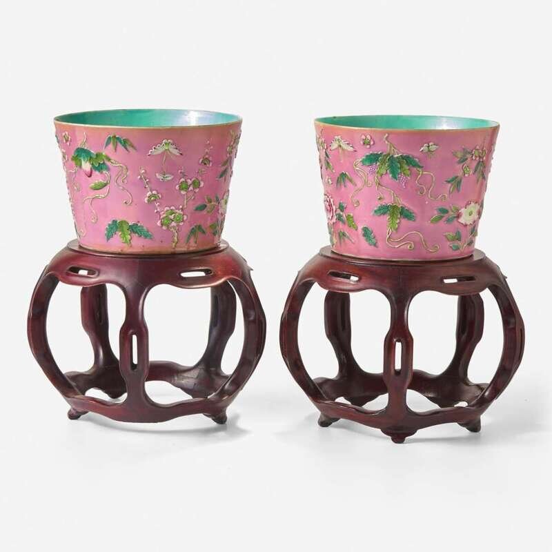 Each of tapered cylindrical form, decorated with various floral sprays, bamboo and butterflies in relief against a pink-enameled ground, the interior turquoise, base pierced twice for drainage, together with an associated pair of stained hardwood stands.