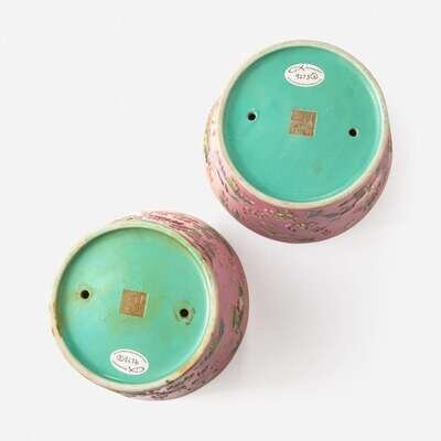 A pair of Chinese famille rose enameled relief-decorated diminutive jardinières 粉彩花盆 Unglazed six-character Qianlong seal mark in relief ?????