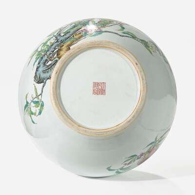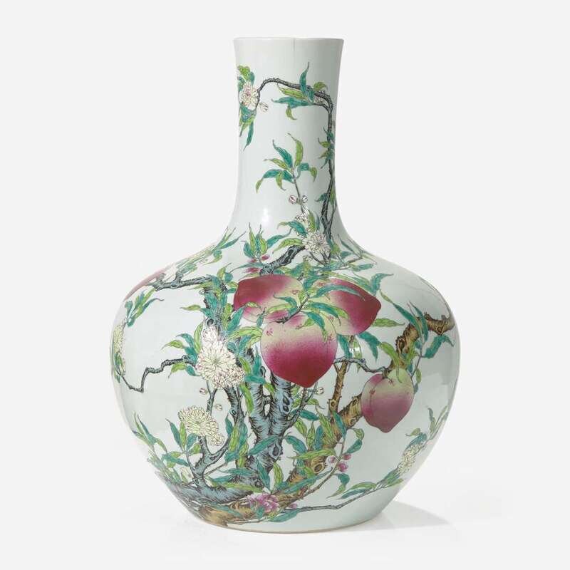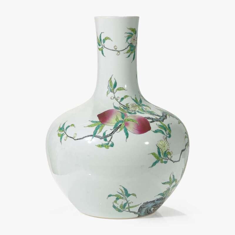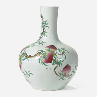 A large Chinese porcelain famille rose "Nine Peaches" vase, tianqiuping 粉彩九桃紋大天球瓶 Qianlong mark ???