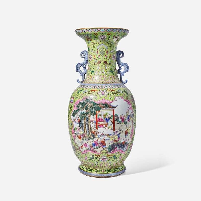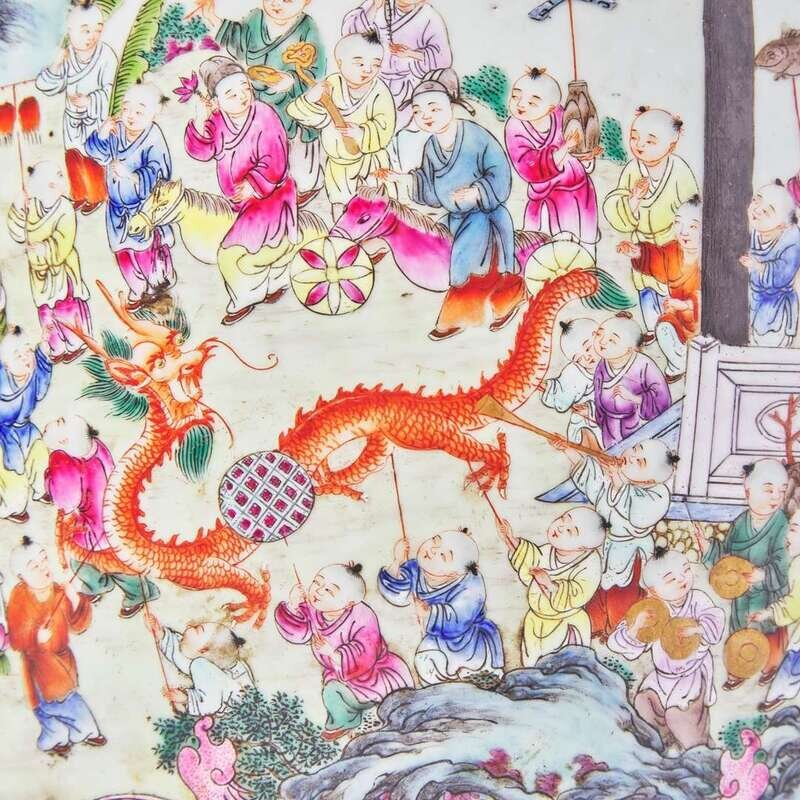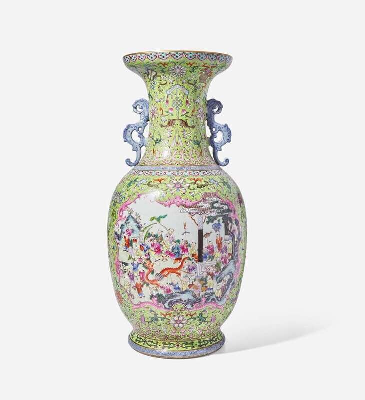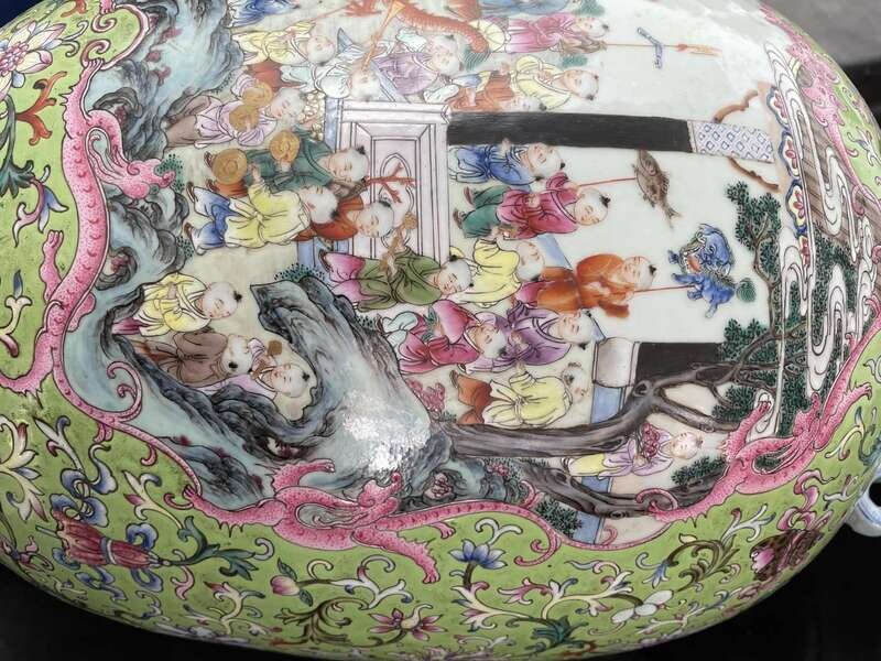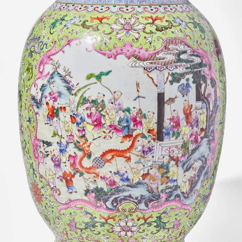 Centered by two panels with scene of boys at play, one scene with boys playing music instruments, the other with boys in a "dragon dance", both panels surrounded by archaic dragons, rest of the body filled with Buddhist symbols amidst lotus scrolls on lime-green ground, the twin handles depicted as stylized phoenix, rim and borders gilded, six-character iron-red Jiaqing mark to the underside.