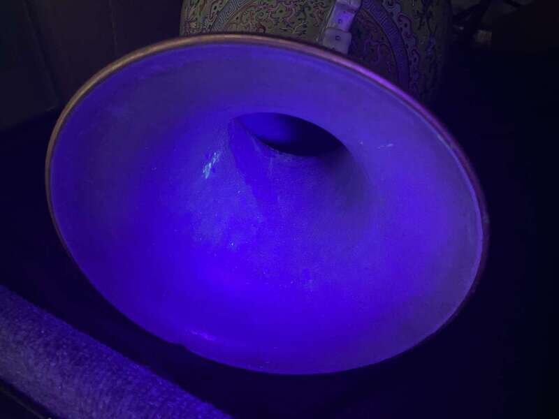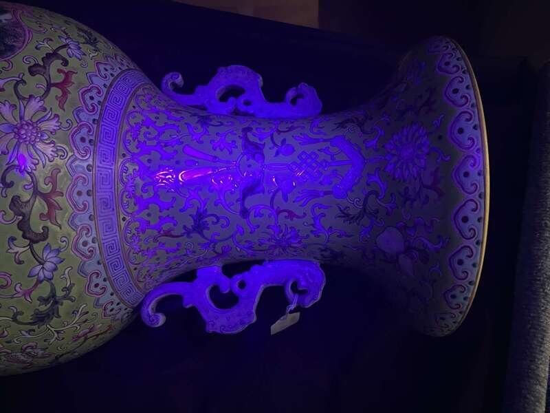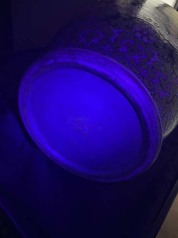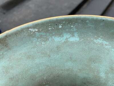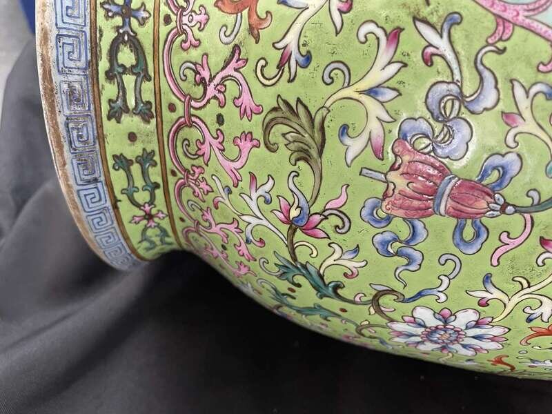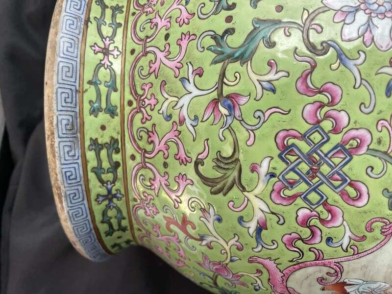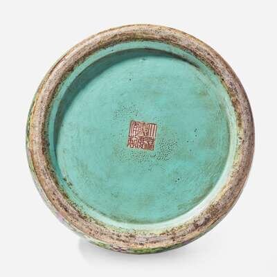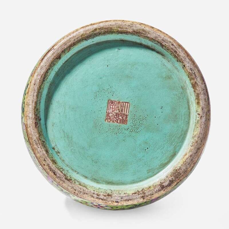 Centered by two panels with scene of boys at play, one scene with boys playing music instruments, the other with boys in a "dragon dance", both panels surrounded by archaic dragons, rest of the body filled with Buddhist symbols amidst lotus scrolls on lime-green ground, the twin handles depicted as stylized phoenix, rim and borders gilded, six-character iron-red Jiaqing mark to the underside.