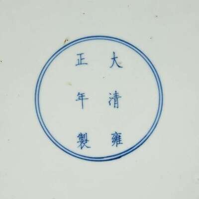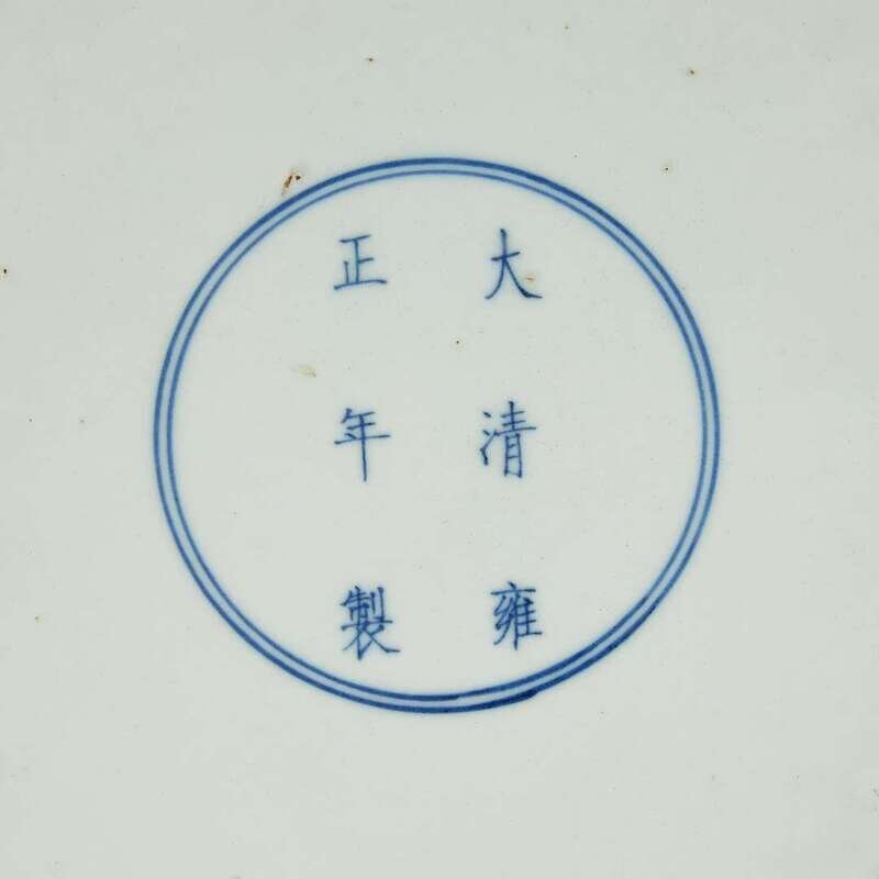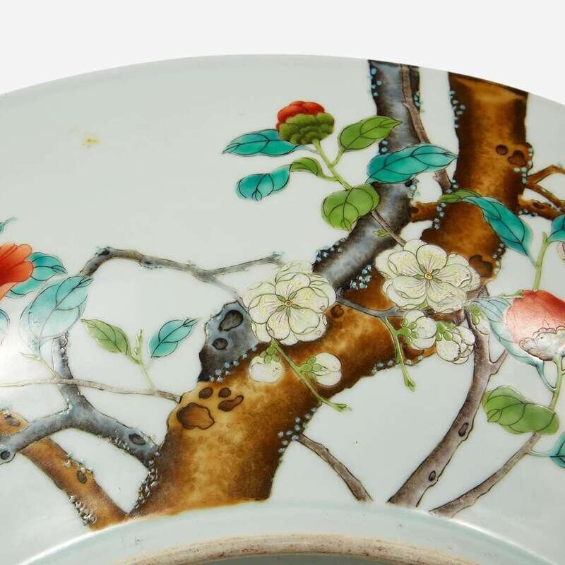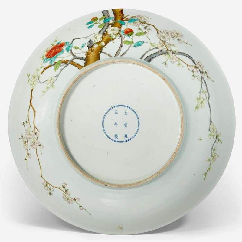 Depicting two prunus branches and two peonies "growing" from the foot on the exterior, the smaller branch with white blossoms extending clockwise, and the larger branch with pink blossoms extending counter-clockwise; both branches painted over the rim to the interior in "Guo Zhi" ("crossing branch") style, the interior centered by a branch of pink prunus, a smaller branch of white prunus to the side; two lingzhi and peonies grow from the branch, two insects above; the low circular footring with underglaze blue six-character regular script Yongzheng mark.