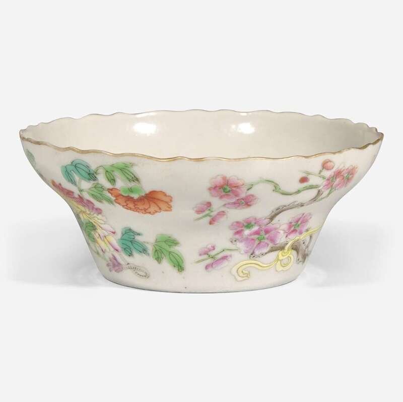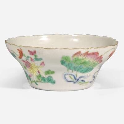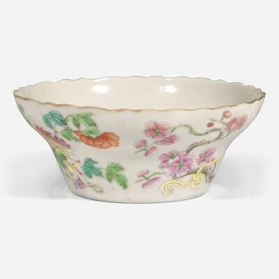 Of ogee form with barbed and gilt rim, the exterior of the bowl decorated with flowers of four seasons: peony, lotus, chrysanthemum, and prunus; bamboo, chrysanthemum to the bottom of interior, centered by camellia; Iron red six-character Jiaqing mark to the underside.