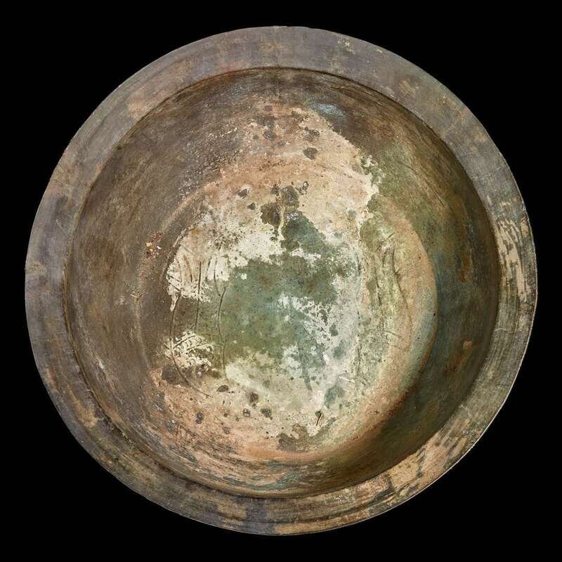 The vessel of slightly tapered cylindrical form with two upright loop handles at the shoulder, the exterior decorated with bands of geometric and linear ornament in low relief; the basin of slightly spreading circular form with wide flared lip, the interior bottom cast with two fish, the base of the exterior with a band of stylized figures, the underside centered by a star, with a similar band of figures and flying birds encircling it, mottled verdigris patina