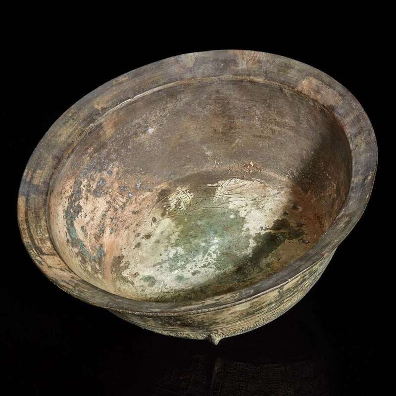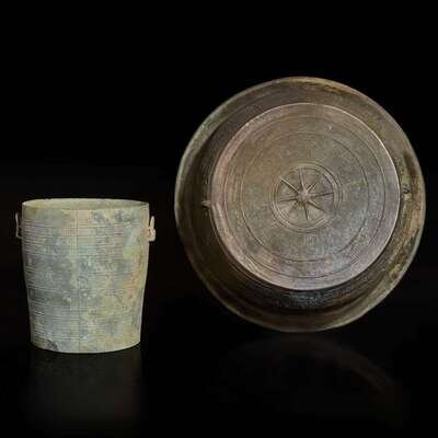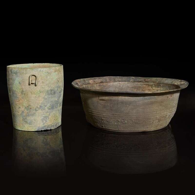 A Vietnamese bronze Thap (Situla) and a bronze basin 越南青銅筒與盆 Dong Son Culture, circa 500 BC to 1st century AD and 100 BC to 300 AD ?? ???500?-??300?