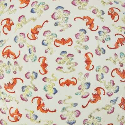 The dished circular charger on low circular foot, the interior and exterior decorated with iron-red bats among colorful ruyi-head shaped clouds, six-character mark to underside in iron-red, later inscribed "CHINA"
