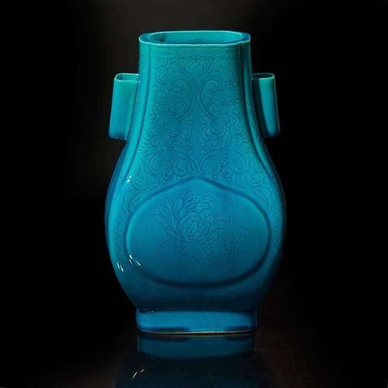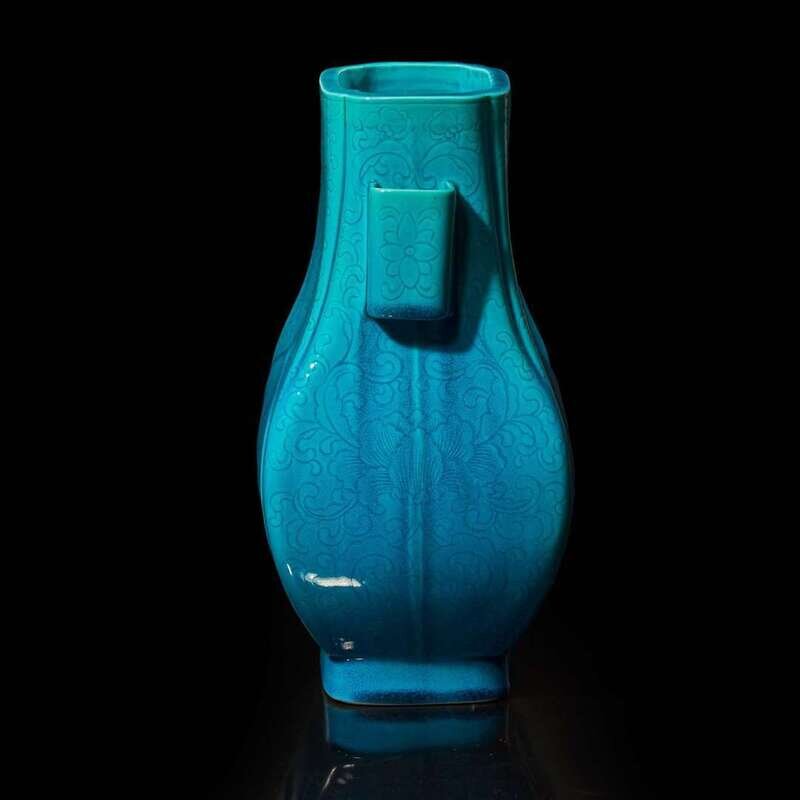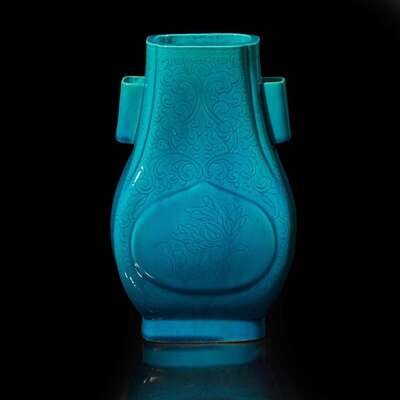 A Chinese turquoise-glazed floral-incised porcelain vase, Fang Hu 松石綠地暗花方壺 Possibly Guangxu period ?????